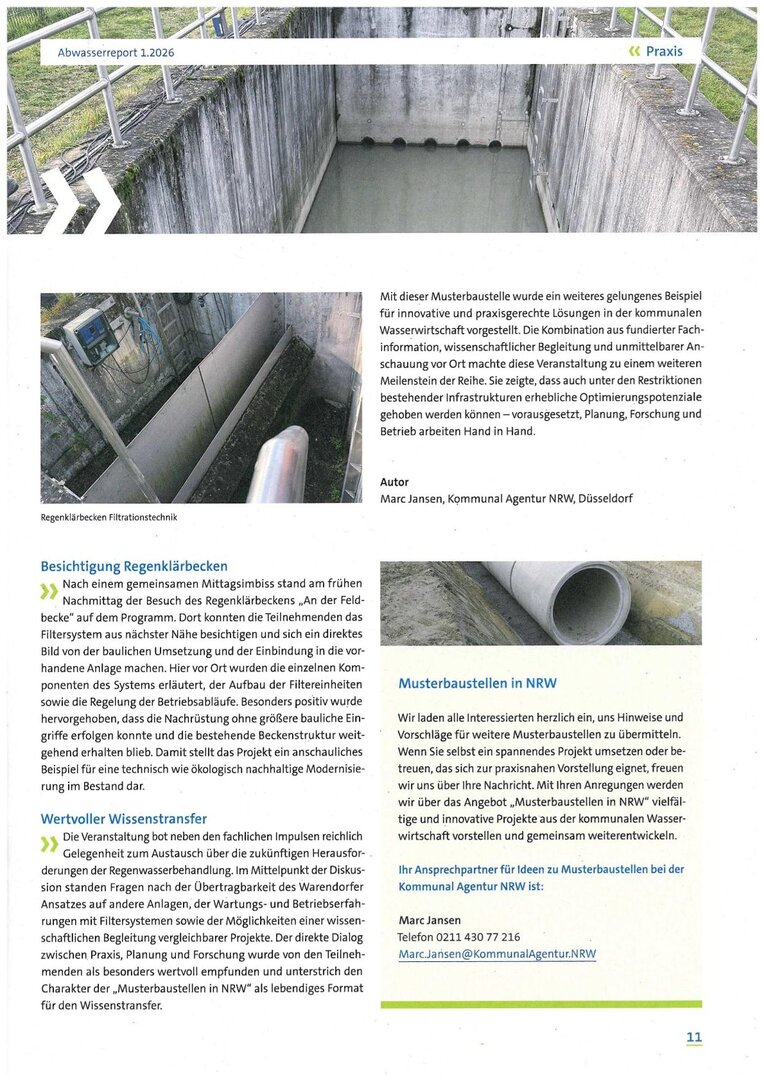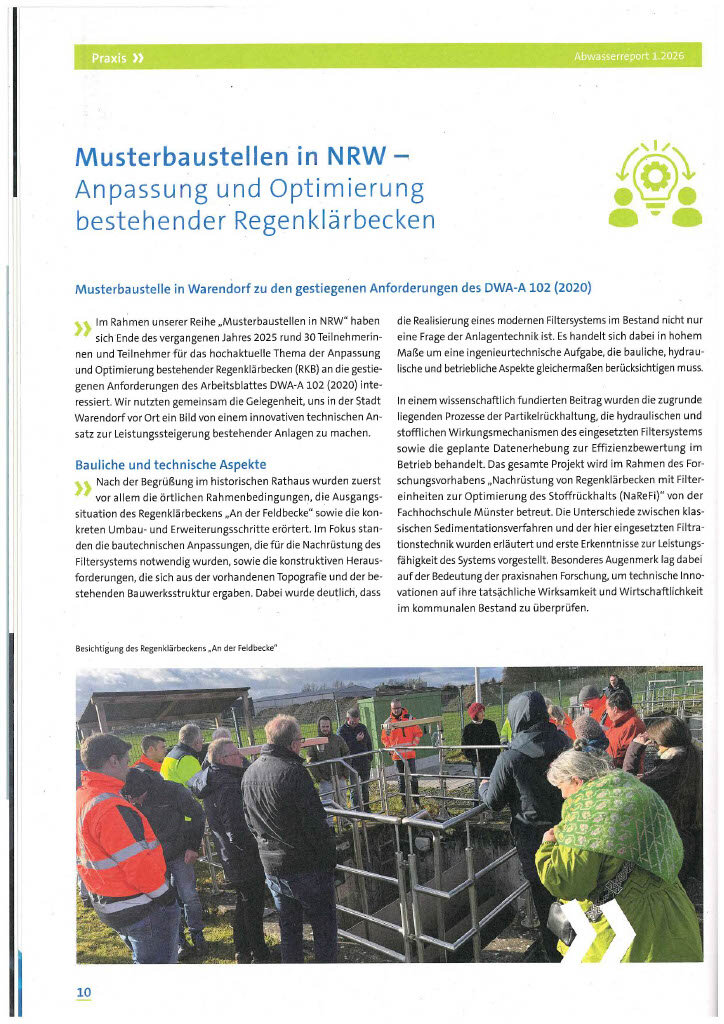 Im Abwasserreport 1.2026 der Kommunal Agentur NRW wurde ein weiterer Artikel über unsere Anpassung und optimierung bestehender Regenklärbecken als Musterbaustelle veröffentlicht.